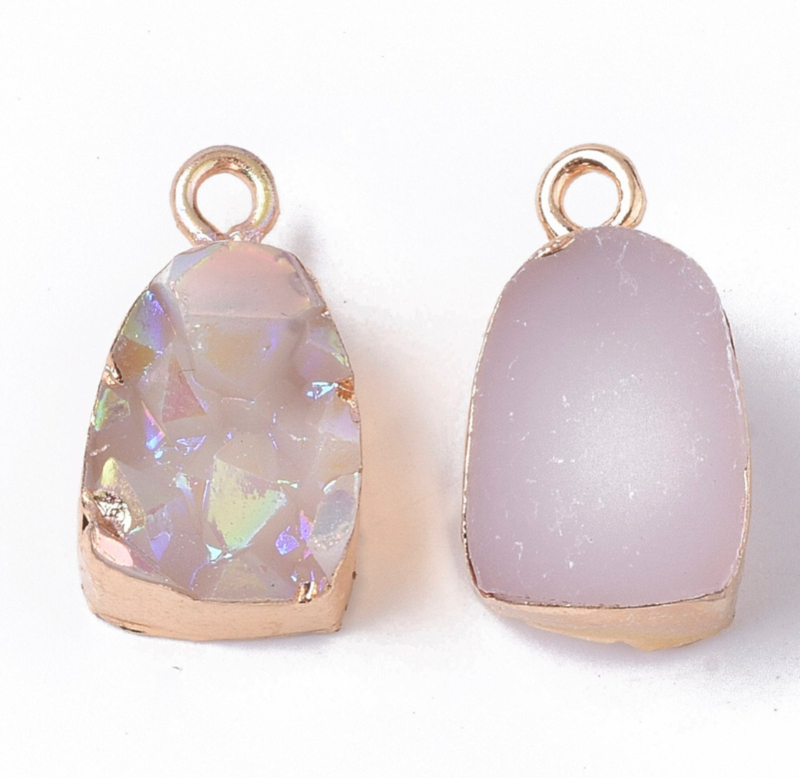 OverzichtGeef je sieraden een luxe sparkle met deze resin bedel in druzy-look. De iriserende (AB) glans met goudkleurige rand vangt prachtig het licht—ideaal voor oorbellen, kettingen, armbanden en sleutelhangers. Je ontvangt 1 stuk in het formaat 18x10x8 mm.