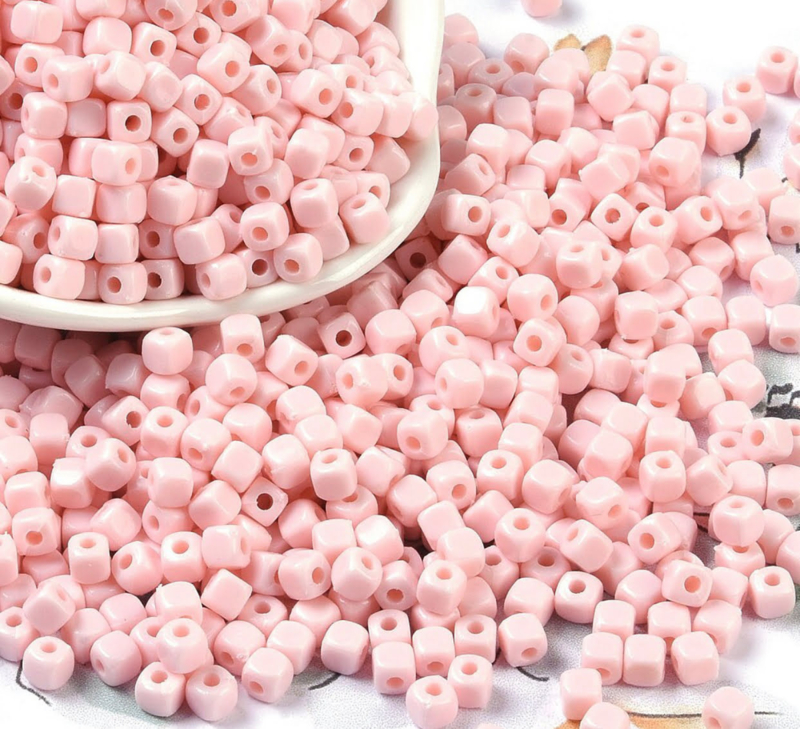 OverzichtZachte lichtroze kubus kralen voor romantische en lieve sieradenontwerpen. Mooi te combineren met wit, goud of pastelkleuren.