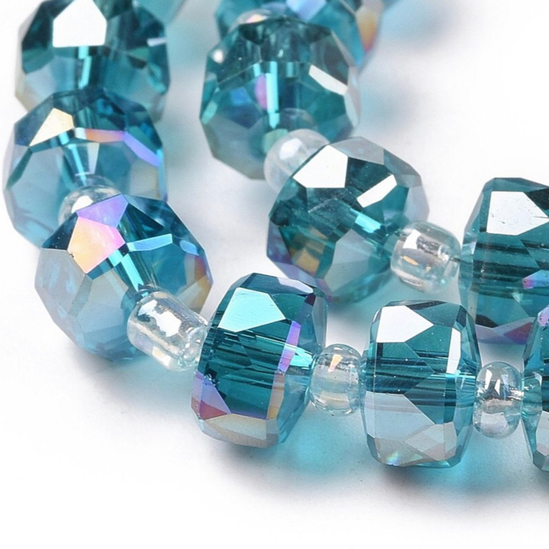 OverzichtDeze petrolblauwe electroplated glaskralen hebben een diepe kleur met een subtiele iriserende coating. De facetgeslepen vorm zorgt voor een prachtige lichtreflectie, waardoor sieraden direct een luxe uitstraling krijgen.