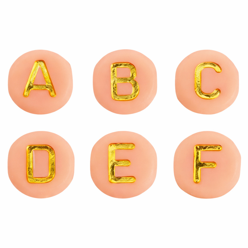 Deze ronde letterkralen zijn peach van kleur met gouden letters en ideaal voor het maken van naamarmbandjes, sleutelhangers en andere persoonlijke sieraden. De zachte peachkleur in combinatie met de gouden letters geeft je creaties een warme en luxe uitstraling.