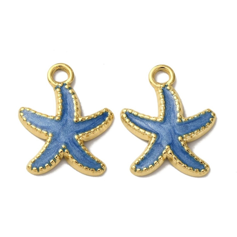OverzichtDeze stainless steel bedel in de vorm van een zeester heeft een mooie blauwe kleur met een goudkleurige rand. De frisse kleur en het speelse ontwerp geven je sieraden een zomerse en luxe uitstraling. Ideaal voor armbanden, kettingen, oorbellen en andere creatieve projecten.