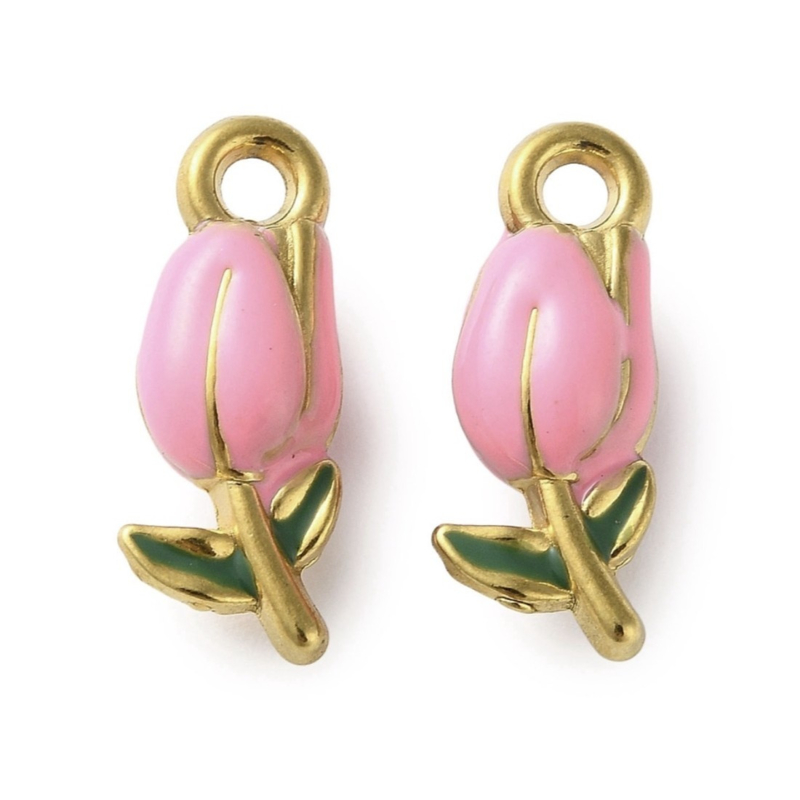 OverzichtDeze vrolijke stainless steel bedel in de vorm van een tulp heeft een zachte roze kleur met goudkleurige details. Perfect voor het maken van speelse en lente-achtige sieraden.