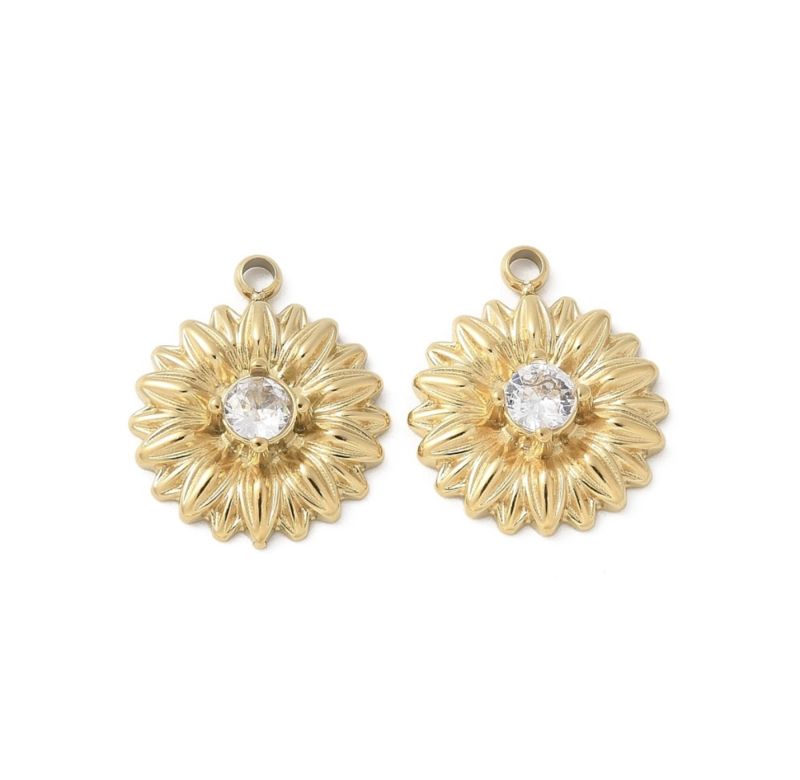 OverzichtDeze stainless steel bedel in de vorm van een zonnebloem is een echte blikvanger dankzij het sprankelende strass steentje in het midden. De goudkleurige afwerking en fijne details geven de bedel een luxe en zomerse uitstraling.