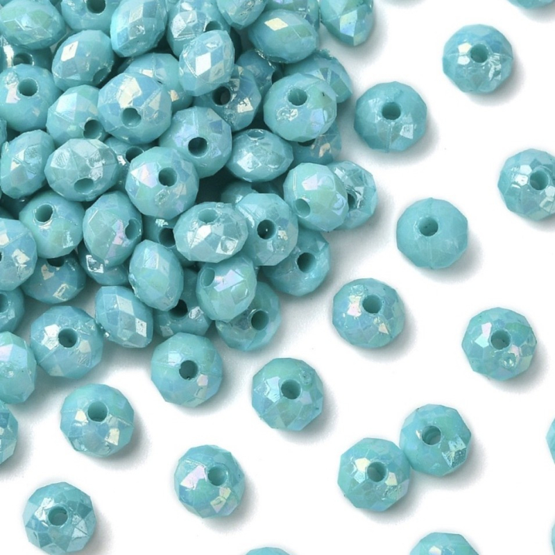OverzichtDeze facet geslepen kunststof kralen in turquoise hebben een opvallende en frisse uitstraling. Perfect voor kleurrijke sieraden.