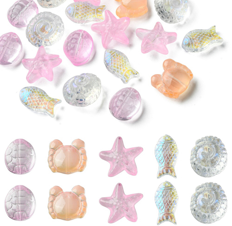 Een glaskralen mix in lila tinten met verschillende oceaanfiguren. De zachte paarse kleur geeft een dromerige en elegante uitstraling aan sieraden.