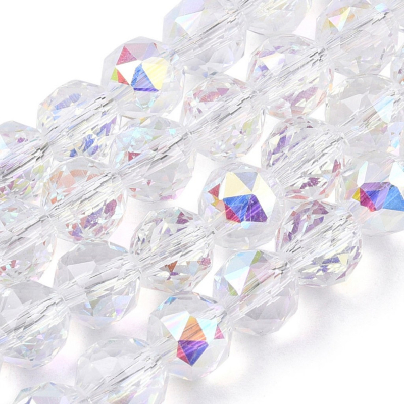 Facetgeslepen glaskralen met een transparante basis en een subtiele electroplated glans. De facetten zorgen voor een sterke lichtreflectie, ideaal voor sieraden met een sprankelend effect.