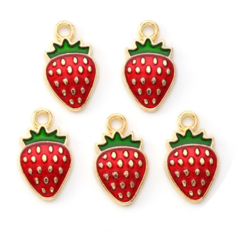 Vrolijke aardbei-bedels met rode emaille en groene kroontjes. Superleuk voor zomerse sieraden en telefoonkoorden.