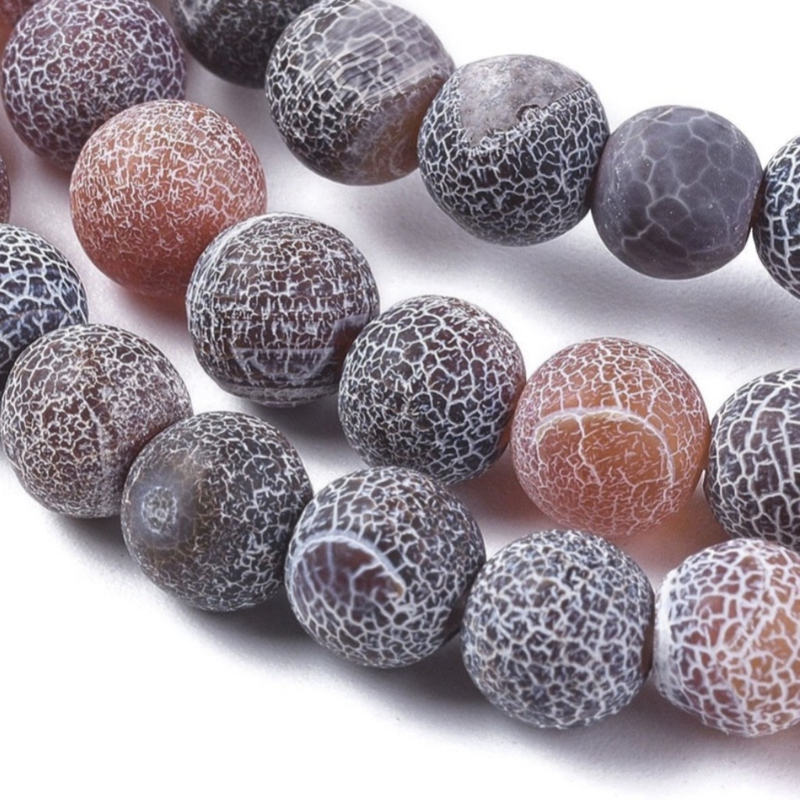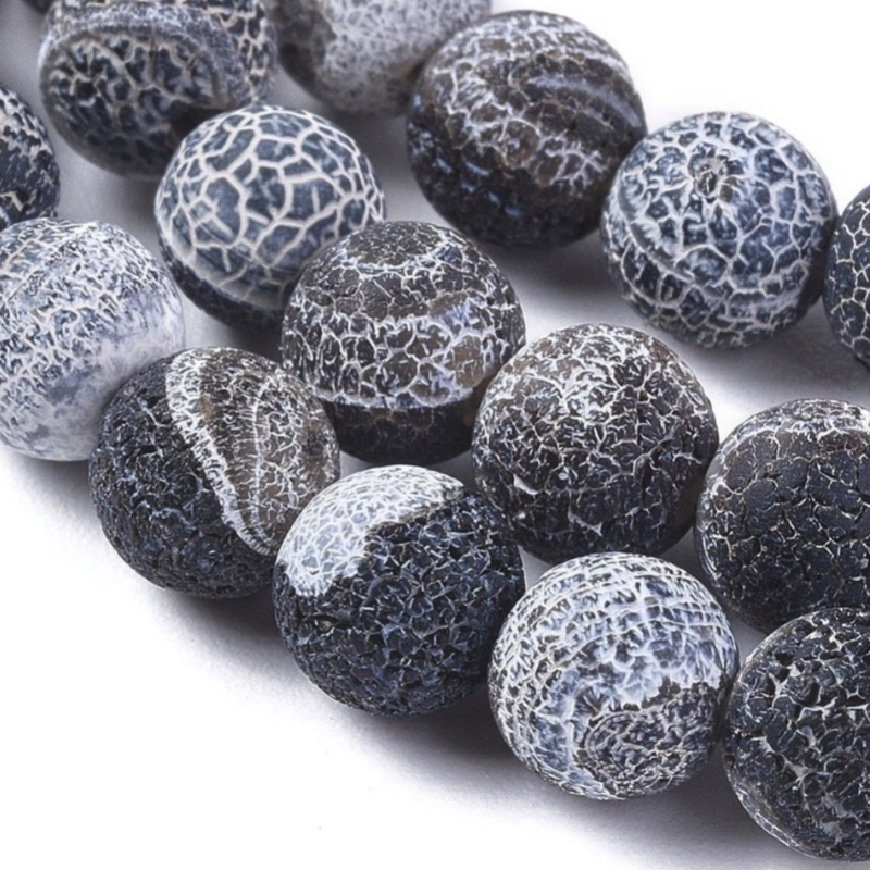 Zwart-grijze crackle agaat kralen met een stoere, gemêleerde uitstraling. Ideaal voor herenarmbanden of sieraden met een krachtig karakter.